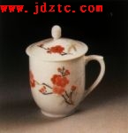 在这里有必要说一下茶杯的造型。解放初期,中国市场上的茶杯除去仿西洋咖啡具的造型外,只有两种中国传统造型。一种是类于正德形状的莲子杯,一种是“中山筒“。中山筒流行于民国,据说国民党政府会议上使用的茶杯都是此种造型,它由此得名。“莲子杯“即源自正德碗,造型不俗,但当作茶杯并不实用,而圆柱体的中山筒又显得呆板。中国人开会时喜饮茶。在中央开会时,为了减少服务人员倒茶时的干扰,需要一种形状稍大又便于保温的茶杯。为此,五十年代早期,毛泽东亲自手设计了一种带盖子的茶杯。这种茶杯的造型端庄典雅,一派大家风范。据中央工艺美术学院教授张守智先生讲,当年正值朝鲜战争结束,就给它起名为胜利杯。从此胜利杯就在中国流行起来,经四十余年而不衰。1975年制做“毛瓷“,其茶杯仍然采用胜利杯的造型。