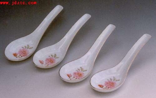 饭匙  这套瓷器不管是釉下还是釉上产品,全部采用手工绘制。而画面绘制者全都是该所优秀的陶瓷美术家或陶瓷工艺美术师。如今,这些人都己是闻名海内外的陶瓷美术家,如王锡良先生、刘平先生、徐亚凤女士、汪桂英女士,戴荣华先生等等。而他们同心同德,相互合作,相互支持,不计名利,表现了一种可贵的精神和品质。当年的艺术室负责人汪桂英女士回忆说;“艺术室主要负责画面、器型的设计、绘制工作。那时大家都没有个人计较,大家共同去搞。釉上画面由刘平、徐亚凤设计水点桃花,釉上画面设计者参与釉下画面的讨论与设计绘制。”