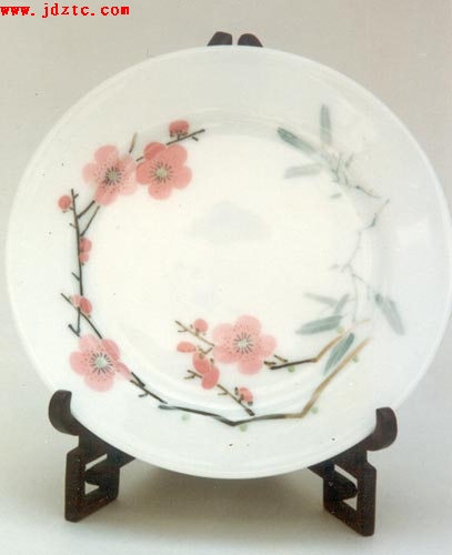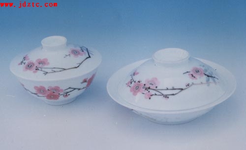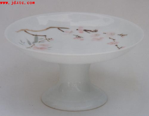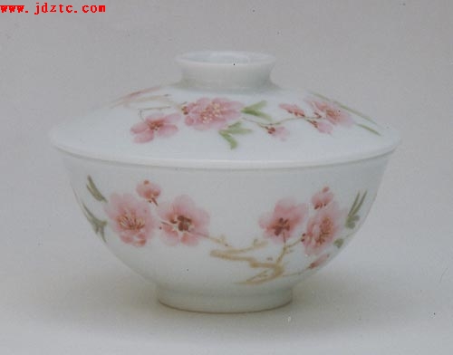 釉上桃花平窝  由于“七五○一”使用对象的特殊性,无论是瓷质、器型还是画面,不管是内在质量或是外在质量,都必须做到完美无缺,无可挑剔。这就要求每一道程序都必须严格要求,不能出丝毫的差错。而任务的领导者和参与者们正是本着这一精神和态度来执行此项严肃的工作。