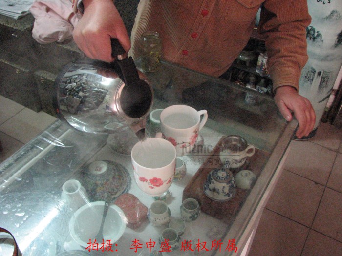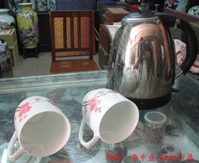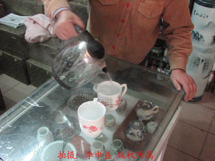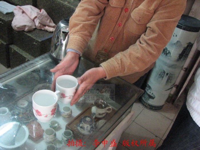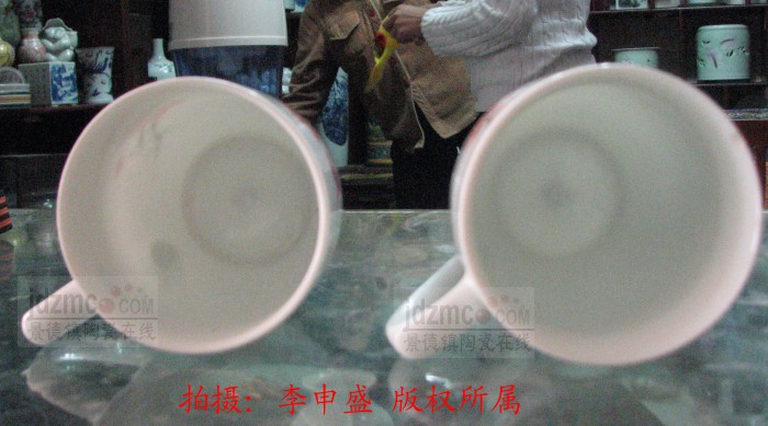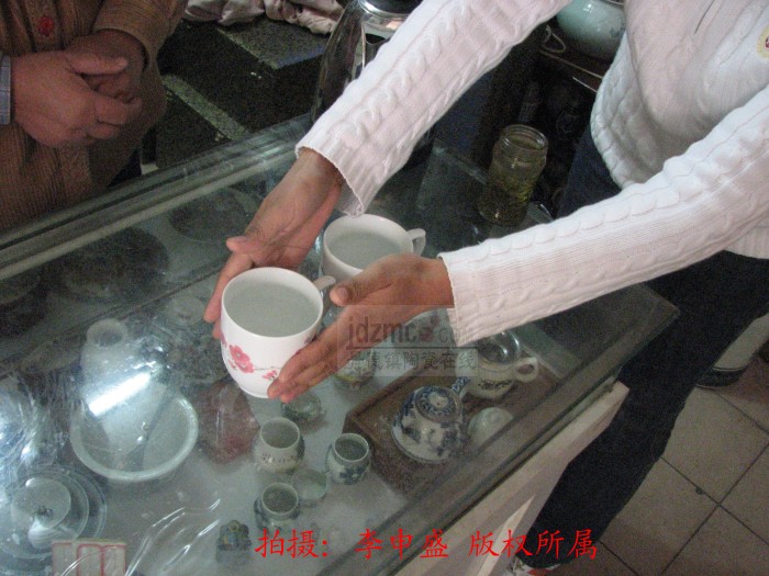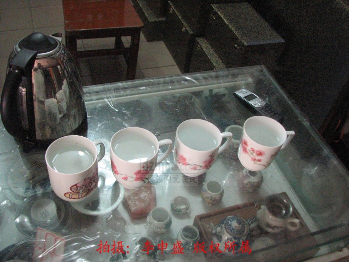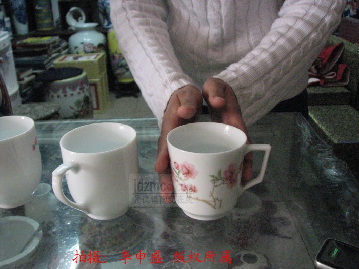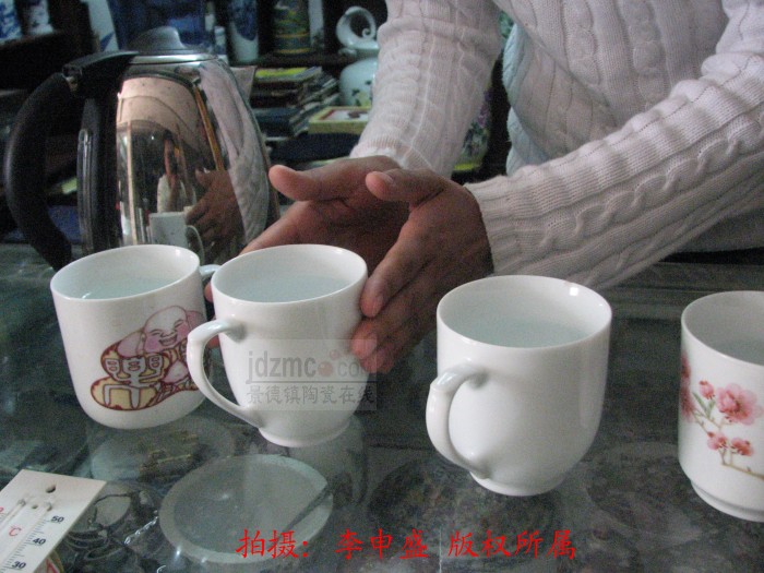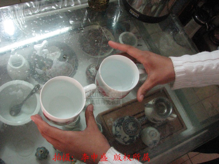 实测 7501毛主席用瓷(毛瓷)瓷杯隔热效果 测试结果:这一次的测试很意外,真伪毛瓷对“准100摄氏度”的水没有很好的隔热性,手部在外壁接触,两个感觉温度一样,变化微小,过于烫手,无法稳定拿起。在放置10分钟-20分钟内,不断外壁手部感触,两个情况一样。 第二步,因为第一步的测试结果很意外,难道毛瓷隔热性很差,还是没有比较。是不是通过和其它不同材质的瓷器杯子比较后,才有差别。于是,又开始做了第二次测试。 测试结果:4个杯子的外壁手感完全一样,过于烫手,双手无法稳定拿起瓷杯,毛瓷和普通瓷质的茶杯的隔热性几乎一样,差距微小。在放置10分钟-20分钟内,不断外壁手部感触,四个瓷杯情况一样。 结论,毛瓷的一个卖点是隔热保温的作用,那么通过这样一个非专业的测试,至少我们产生了一个疑点,在今天的景德镇陶瓷工艺发展,发达的今天,7501瓷的很多卖点是绝对还是相对的,是概念性的,还是实际性的?薄度,透光度,隔热性等,许多陶瓷(胎)制品至少是能够达到7501的相似程度,如果我们真的拿一些非临川土的瓷器制品来和临川土的制品做比较,相信,非专业人士都是很难鉴别的,这个也留给了许多人钻空子的机会。