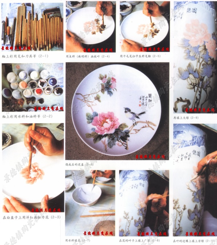 先在白盘子上用洋红画牡丹花;再用生料(珠明料)画枝叶;然后用干毛笔扫平生料笔触,使这笔触匀称,丰富细腻;再用水料填色,镜头移向瓶子,程序可以衔接;在花的叶子上填上广翠再填上大绿在叶的边缘上填上苦绿;瓷盘创作完成,经窑炉烧成。