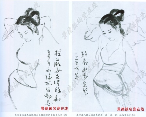 (1)《南山采薇》瓶创作过程:先在纸上勾画创作草图,从整体姿态着眼,用疏朗的线条勾出头、颈、胸、胯的大体关系。第一步尤为关键。然后进行局部深入。用笔大胆铺陈,细心收拾。