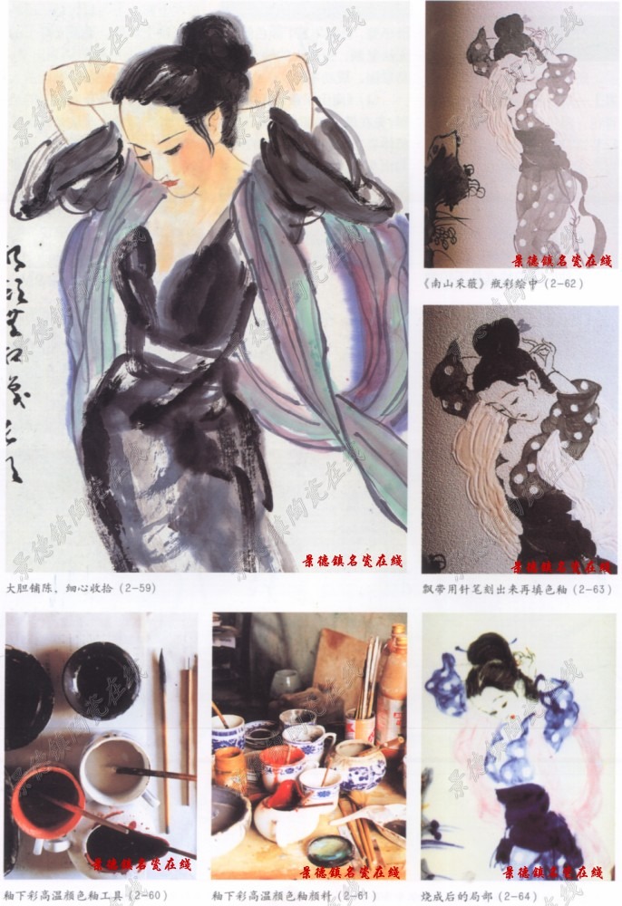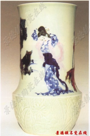 首先画瓶的下半部,在泥坯时雕刻有植物图案,刻好之后在上面吹上一层底釉,这是在底釉上彩绘。采薇女身上的飘带线条先用针笔刻划出来,然后填涂淡紫色釉,图为放大局部,可见笔墨在底釉上的感觉。此作品最大难度是:落笔无悔,就像宣纸上着墨。因此必须事先打好腹稿,或另在纸上打好草稿,要求有较强的造型基本功力。彩绘完毕,用青釉罩上一层,然后入高温窑烧成。这是烧成后瓶的局部。