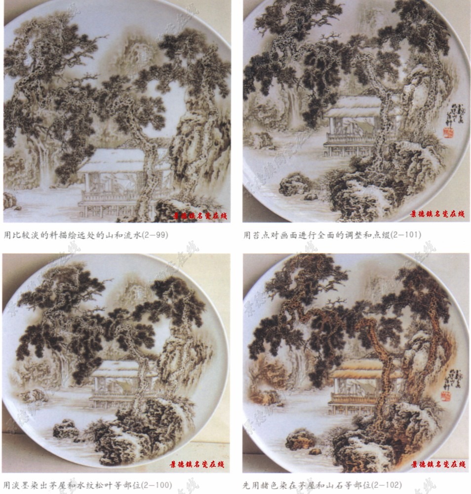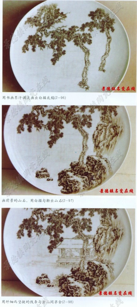 粉彩山水画基本步骤:用书画墨汁调淡画出白描底稿,然后先画前景的两株松树,取双勾法,自上而下用中锋线条,浓墨勾出松树主干,然后勾出松鳞和枝丫。在料未干前用狼毫小笔打扁擦出松鳞的阴阳纹理。再用浓墨画松针,在规范中求变化,注意松树的外形特点,和树姿的美感。
