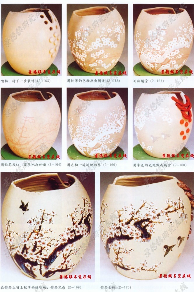 煅烧:在烧之前,必须在装饰好的作品上喷上一层较薄的透明釉,以免在搬移时破坏或弄脏釉面,俗称“色脏”。烧成温度一般在1330℃左右,约10个小时。在烧制作品之前要了解窑炉的性能,烧成气氛为还原焰。(图2—160—170)