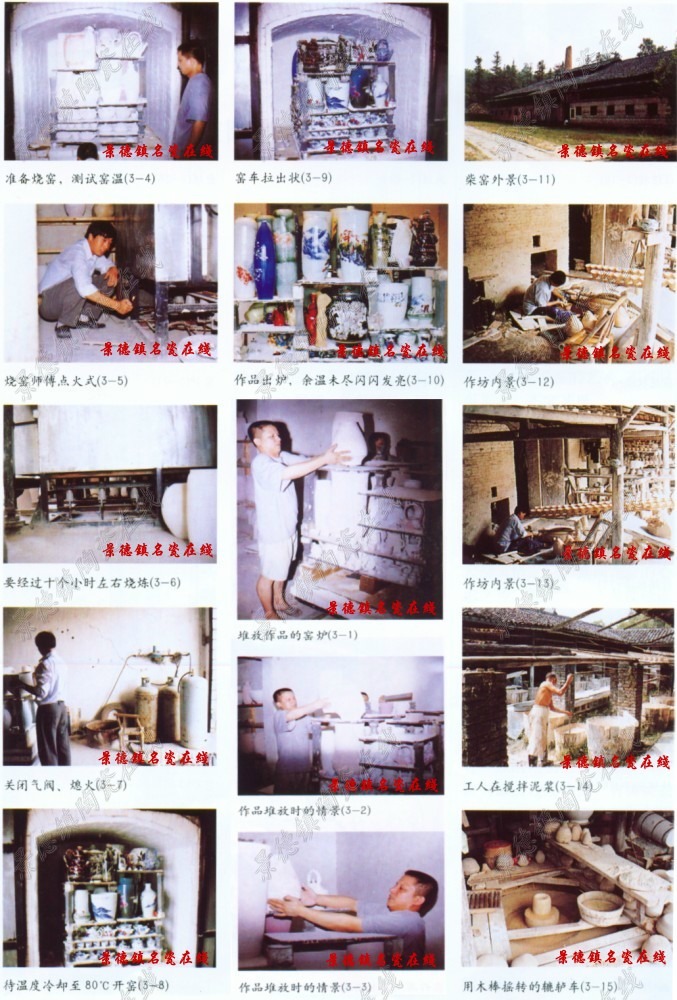 图为炉身的结构,内部电炉丝用耐热棉与外部隔开,炉车固定不动,炉体下部装有轮子,可以来回移动,与梭子窑相反;工人在拉移炉体;未烧的瓷器正在被装上炉车;将炉体向炉车拉拢,炉壁内电炉丝与耐火棉的结构清晰可见;节能温控装置,中间为闸阀;为节能控温屏,温度可进行微调,烧至800~C左右后,待炉内温度冷却至50~60℃时开炉,温度愈低愈佳,以防釉惊裂,图为开炉时情景。(图3—11~28)