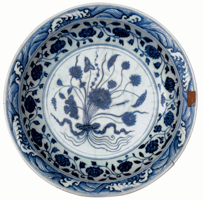 | 明清期间,青花瓷器的主产地集中于江西景德镇。由该镇产出的青花瓷制品,品类花色众多,质料上乘。从外观上看,其大多数产品型制作工规整,轮廓自然舒展,装饰图案线条流畅而富于变化。当中特别要以那些贡品官窑(明代称“御器厂”,清代称“御窑厂”)器和部分“官搭民烧”器为其代表。此类瓷作皆为瓷中精品。这些精品瓷作,首先在制胎、拉坯及修坯方面,操作流程要求极其严格,工艺十分考究。因此成品瓷,胎土匀净,胎质洁白坚密。而在器表图案装饰方面,更是一展两朝画师之所长,他们对瓷胎上的画作进行缜密地推敲,并予以合理布局。 随着时代的变迁,两朝画师所用青花颜料(氧化钴)在不同阶段也不尽相同。既有采用明代早中期从阿拉伯(伊拉克)等地区购进的进口“苏麻尼青”料;也有明中期以后取自国内新疆的“回青”料、浙江的“浙青”、江西的“平等青”和云南的“珠明料";还有明至清代民窑最常用的江西“石子青"等青料。国产青料的使用,早在明代早中期民窑青花瓷图案中就有所反映。如明成化年的“青花夔龙纹盖罐”,既是明中期典型的民窑器,所用青料就是国产“石子青”,其发色蓝中带灰。而此时官窑器的青料仍以进口料为主。到明成化年后期,由于进口“苏麻尼青”料的严重匮乏以至枯竭,官窑器上的图案也必须以国产青料来作画。成化晚期的官窑器,基本上采用的是呈色淡雅清亮产自江西的“平等青”。为能达到青料发色的完满,瓷艺匠师们,只能在原有民窑国产青料的使用基础上加大研发力度。他们经过在画作中的长期实践,创造性地用国产钴料研配出各种不同色阶,因而得到了迅速地推广及运用,最终摆脱了进口青料在青花产业上的局限。 “苏麻尼青”料与优质国产料的相继应用,使画师们能更充分地运用其手中的丹青妙笔,在作画时挥洒自如,尽情地采用勾、描、填、涂、抹、皴等行笔技法。凡在瓷胎上绘制花鸟鱼虫、山涧溪流、海浪祥云、怪石芭蕉、草木瓜果或是楼台水榭、神仙佛道、飞凤游龙、瑞兽八宝、刀马人物以及人物故事、玩婴嬉戏等诸多的装饰图案,均能展示出他们高超而深厚的艺术功力。 明早期永乐、宣德年的官窑瓷器,纹饰题材日趋丰富,以动植物图案为主要装饰,作画用进口“苏麻尼青”料。如“青花花果带盖梅瓶”,为明永乐官窑传世品。通高41.2厘米、口径5.5厘米、底径12.2厘米。瓶设钟式宝珠纽盖、溜肩鼓腹,腹上提、胫内敛。器表青花图案发色浓艳,大小不均深陷胎骨中的黑褐色斑点,不规则地散布于略带晕散的花果叶蔓之中。盖面绘缠枝莲与折枝海棠纹,肩部勾画变形覆莲瓣纹。主题纹饰或以双勾填色或以平涂勾边的写实技法,将叶蔓、花朵、石榴、枇杷和桑椹等花果描绘的鲜嫩欲滴,香气四溢。而胫部则以平涂勾边,细描叶脉纹来绘制重叠上仰的蕉叶纹一周,该纹象征环抱托起之寓意,使梅瓶挺拔而显稳重。 “青花海水白龙纹扁瓶”,明宣德官窑传世品。通高47.4厘米、口径8.1厘米、底径15.7厘米。直口、束颈、溜肩、圆扁腹。颈部饰青花缠枝牡丹花纹,以单勾平涂技法绘成,颈下肩部书横向“大明宣德年制”楷书款。器腹满饰勾边露白青花海水波涛,使蓝白相间的波涛翻腾汹涌、层次分明。青花发色浓艳深蓝,亦有小颗粒黑褐色晶斑散布于图案之间。主题纹为一条穿波戏浪回首观望的白龙,白龙轻舒利爪,回首开口,舞动劲键的躯体,搏浪前行,神态威猛,极富动感。 “青花一束莲纹折沿盘”,明宣德的传世品。高7.9厘米、口径44.8厘米、底径29厘米。折沿、弧壁、深腹、圈足。沿面绘青花海涛浪花纹,海涛以单线细描,浪花双勾露白。这种蓝白互用的表现手法,尽显浪涛汹涌澎湃之立体感。内壁平涂勾边,饰一周青花缠枝莲纹,莲花绽放、叶蔓繁茂。盘内心主题纹为青花一束莲。朵花、叶蔓分别以双勾填色、一笔点画绘制而成。青花呈色浓艳,图案运笔细腻流畅。 进入明中期后,纹饰发展趋于多样化,除动植物纹外,人物和景物装饰图案也较常见。此时的官窑器,最善用由“回青与石子青”配制而成的国产混合青料,“佛头青”是此时最上乘的青料,其发色深蓝泛紫,清亮艳丽。“青花云龙纹罐”,明嘉靖官窑传世品。通高52.8厘米、口径24.7厘米、底径30厘米。直口圆唇、溜肩、鼓腹,平底略凹。颈之间书“大明嘉靖年制”横向楷书款。肩部巧用勾边填色技法,饰以青花缠枝莲纹。腹部主题纹,亦以勾边填色之法绘制出青花双龙庆寿图。双龙腾空飞舞,张口瞪目,首尾相随,龙首与龙尾之间草书一“寿”字。整体纹饰布局繁满,龙文虽矫健生动,但图案线条较前朝龙纹比照仍觉力度欠缺。 “青花人物龙凤纹盘”,明万历官窑传世品,足底书“大明万历年制”楷书款。高5.5厘米、口径32厘米。撇口、弧壁、浅腹、圈足。内壁饰青花双龙凤火珠云气纹,青花主题神仙人物纹绘于盘心。主题人物纹与辅助龙凤纹,皆以勾边填色绘画而成。人物清瘦高古,衣无折皱,眉目迷蒙,给人某种神秘之感。龙凤纹体态修长,飞舞飘逸。 我国青花瓷器的图案装饰工艺,经历了漫长的发展过程,至清代时已经完全成熟。此时官窑和民窑器的图案题材不仅广泛,而且绘画更为精湛。清康、雍、乾三代,是青花瓷发展中的又一鼎盛时期。“康乾盛世”,为了满足皇族的需求和高档瓷的外销,御器厂开始实施“官搭民烧”制度,至此形成