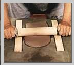 先在陶土下垫一块布,用手掌将粘土丘扁。然后在粘土的两端各放置一和所需泥板厚度等厚的木条,用摊面棍前后滚压,直至压到和木条厚度相同为止。适于制作较大面积的泥板。 | |