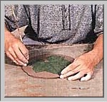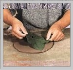 | 7.从中向外按压叶片到靠近垫有泥条的边缘,使之接触到案板。 | 8.揭下叶片。 | |