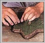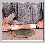 2.用泥滚在叶上滚压,加深纹理,压至叶片微微嵌入泥片。 | |