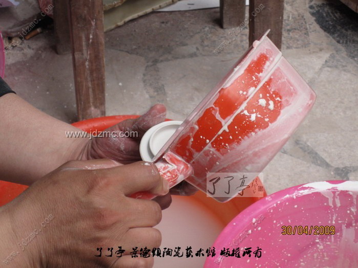 荡釉是景德镇陶瓷传统的施釉方法之一,操作时把釉浆倒入器坯内部,然后晃荡,使上下左右均匀上釉,多余的釉浆倒出即成,这种方法适合于瓶、壶等琢器。 陶瓷施釉技法之一。方法用勺舀釉注于器内,把坯器稍振荡,务使釉浆满布坯体,后倾出多余釉浆,这时将坯体继续回转,使器口不留残釉。适用于器型较深的制品。