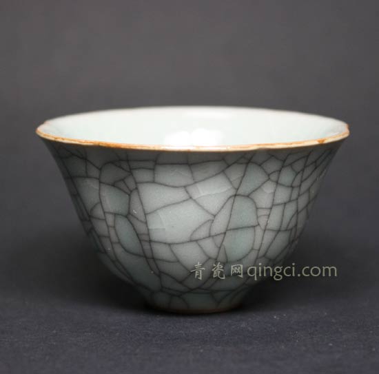 图中的仿哥釉花口杯,是明代成化年间仿哥窑的优秀作品。现藏于故宫博物馆。其器形精致雅洁,呈十六瓣菊花式,通体釉色仿哥釉,釉质肥厚,布满大小不等的开片,以深褐色釉模仿哥窑产品的“紫口铁足”,实为仿哥窑乱真之赝品。