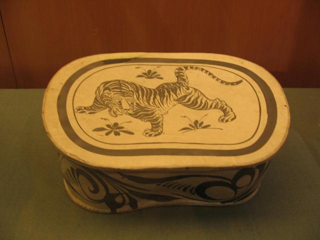 宋代磁州窑瓷枕为长方体,底部印有“张家造枕”、“张家造”、“张大家造”、“张家记”、“古相张家造”等长方形印文戳记,印文有横式、竖式和单栏、双栏几种。最早的作品是宋仁宗明道元年烧制的,烧制时间延续三百年之久。上图是著名的“孩儿枕”,因枕形为一个童子俯卧而得名。宋代景德镇窑青白瓷孩儿枕最为精美,为一个童子侧卧在床榻上,双手持一荷叶,荷叶边下卷,以荷叶作枕面。宋代定窑白瓷孩儿枕,为一小童子匍匐在榻上,双手相搭支于头下,双腿交叉翘起,侧首凝视仰望,面含笑容,其背面是枕面,设计很巧妙,形态十分可爱。
