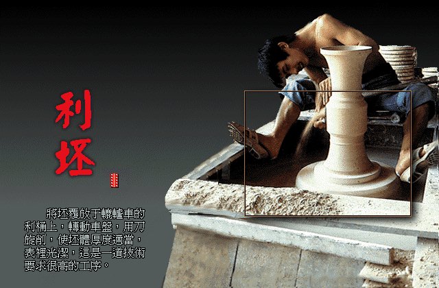 利坯的第一道工序是打粗,把坯从料板上取下来,口朝下底朝天,放在坯桩上,边旋转边扇平,等坯扇得脑里四边均匀,坯体没有丝毫抖动,才算是把坯放稳了。再用右手执死刀子,刀尖朝坯中心而下,左手两指按死刀杪,缓缓随坯切下,一刀定乾坤,不深不浅。然后是倒楞、扎督子、剿表利口沿、平泥、剐月心,月心的深浅大小要以坯的底足为标准,再就是剐齐子、量尺寸,每只坯的尺寸要做到统一,不深不浅,大小均匀。