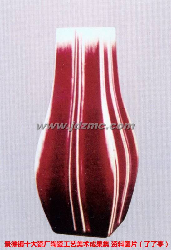 钧红又名均红,始于北宋钧窑。景德镇窑于宋代开始仿造,在长期生产过程中形成具有镇窑独特风格。钧红釉呈深邃均匀的红色,釉面滋润,光彩照人,开片细密,微有流淌,稍有脱口。钧红釉以氧化铜、陈湾、玻璃粉、釉灰、长石、含水石、烧石英等外加食盐配制,用喷釉法三次施于涩胎上,在柴窑拉背二至三路,二、三、四脱重四以上窑位,1300。C左右还原气氛烧成。 (了了亭 资讯,本文刊载于- 景德镇十大瓷厂陶瓷工艺美术成果集)