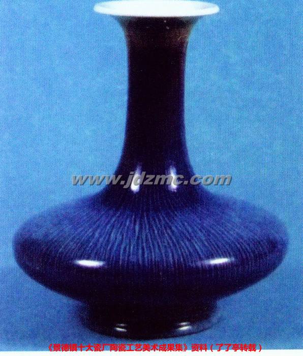 羽毛花釉20世纪80年代建国瓷厂研制成功的新型铜红花釉。分红、紫、蓝色三大系列。各有丝状、点状、鳞状、羽毛状等形。其釉面光泽度,色彩及花纹的稳定性,均超过了传统的窑变花釉。1300。C左右还原气氛烧成。。(了了亭 资讯,本文刊载于- 景德镇十大瓷厂陶瓷工艺美术成果集)