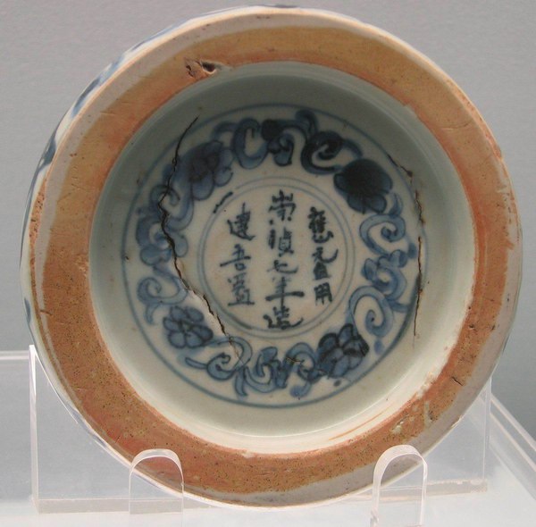 崇祯朝传世品中没见过官窑瓷器,只有民间烧的佛前用器、一般民用瓷器及外销瓷。有一部分供器胎子相当细润,甚至达到清代瓷器胎子细密的程度,施釉稍薄、较白、光润,青花色深蓝,很稳定。还有一种胎子较粗的,胎体厚重,施釉厚,釉子光润泛青。釉中有极细小的黑点,青花颜色暗蓝闪灰并晕散。崇祯青花瓷常见的纹饰有人物故事、达摩、罗汉、高官、仕女、婴戏、龙、凤、狮子、麒麟、牛、马、牡丹、梅鹊、山水、树石、花鸟鱼虫、蕉叶等,粗犷随意。还有一类瓷器,胎子细密坚致,釉面光洁,青花颜色青翠,色阶层次少,一直被认为是清代康雍时期的,因在崇祯二年(1629)沉船中打捞上很多类似的瓷器,使人们的认识发生了转变,和传世品中署.大明崇祯年制.款的类似瓷器互为印证,明确了这类瓷是专为外销生产的外销瓷。