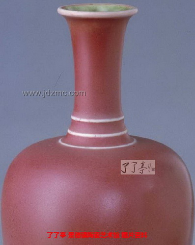铜红釉瓷是以铜为着色剂,运用不同的配制方法和装饰手法,经高温还原焰焙烧,形成不同风格艺术效果的红色瓷器,主要品种有钧红、郎红、祭红、美人醉、釉里红、火焰红、粉红,它们相似相近又各具特色:钧红在素胎上采用浇、蘸、吹等多种方法,使之达到一定厚度,经高温还原焰焙烧,通体深红,纹片细小。郎红在生坯上挂釉,经高温还原焰焙烧,红色鲜艳夺目的红色,大片裂纹。