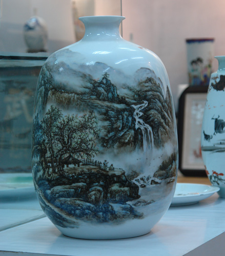 新彩是陶瓷釉上彩的一种装饰技法, 是随着历史的发展, 以及外来文化的大量引进而产生的, 通过不断地完善“新彩”这种装饰方法而慢慢发展起来。 “新彩”技法表现力强,操作简便, 易于掌握。 比其它传统的陶瓷装饰方法少受工艺流程与色料的制约, 是一种便于普及与发展的装饰方法。 “新彩”这一艺术形式适宜表现山水、花鸟、人物等。 一、新彩色料的特性 1、色料: 新彩用色料属于釉上低温色料。新彩的色料都是以金属氧化物为着色剂,配合各种硅酸盐溶剂,再经过熔块炼制而成的,釉上色料的主要成份有两大部分:一是着色剂(色基),主要为各种金属氧化物的混合物,经锻烧成为呈色的矿物质; 另一种为熔剂, 是一种低温玻璃质附着剂,在7 20℃—800‘C的温度区间熔融。这类低温色料色彩丰富,而且比其它类色料稳定性能好,基本上可以满足绘画时的需要。所以在使用时就呈现出与烧成后相似的色彩,这给彩绘时的画面用色带来了不少方便。同时,新彩的色彩种类较之古彩、粉彩更为齐全,并可以互相调配,更好地满足画面的色彩要求。在应用配色时,很多情况下和一般绘画差不多,如洋红加海碧成紫色,薄黄加海碧成绿色等。此外,还可以用几种颜色多次反复配合而得到更多的色彩。这里需注意的一点是, 由于颜色自身的配比不同,配在一起会产生不同的化学作用,所以在运用前必须先试验几次,有了实际经验后就可大胆使用了。由于新彩自身具备调配的便捷性, 可以配制出更多的灰色系列, 所以它能大大改善传统粉彩、古彩过于艳丽火燥的特点, 而增加彩料的高雅特性, 同时为绘制现代装饰纹样提供了条件。 2、油与胶, 油色与胶色: 新彩用油以乳香油和樟脑油为主。乳香油粘稠, 不易挥发, 可作色料的粘合剂或在描绘精细画面时应用。樟脑油较乳香油挥发性强,不易流动,用于稀释色料及表现技法。新彩用胶一般为动物胶,主要作调色粘合剂用。乳香油、樟脑油和胶均属于有机物质,加高温后会碳化、挥发, 因此用其作瓷与色料间的中介是较理想的。陶瓷色料为粉状物, 绘画时须先将其用油或胶调制成油色或胶色。用乳香油调制的为油色; 用动物胶调制的为胶色。绘画新彩人物时主要用油色与胶色。油色与胶色的优劣直接影响绘画效果, 因此调制技巧是较关键的一环。油色的调制:先取适量细色料,然后逐渐加入乳香油, 同时用调色刀搅拌。当外观基本成团并仍有少量干粉粒没有被润透时,可以调入微量樟脑油,用力反复挤压、摔砸直至色团表面出现一层油膘即告完成。胶色的调制: 取1:1 0的动物胶和清水, 置于一容器内加热至沸腾成胶水。然后,把胶水加入到色粉中,用调色刀反复揉压、摔砸成结构紧密结实的色团。调制好的油色与胶色要分别放置于各自的容器内, 并且要加盖防尘。 二、新彩装饰的工具 新彩装饰的主要工具有笔、油碗、调色刀、海绵、 白布、脱脂绵。陶瓷彩绘用笔一般是特制的,特制的陶瓷彩绘笔的笔杆和笔头都较普通的笔细而长, 这是因为陶瓷色料为矿物质,在使用时粘稠,不如国画颜料那样易于下笔。利用力学原理将笔杆和笔头加长加细,就能勾画出流畅而绵长的线条。彩绘用笔分铺色笔和线子笔。铺色笔主要由各种型号的柔软、纯净、弹力好的羊毛制成。大面积铺色可采用羊毫板刷。勾线用笔分两种,羊毫线子笔和狼毫线子笔。另外,绘瓷还需要部分自制的笔,如:扒笔,用刀把竹制笔杆顶端削成尖齿状, 用于划刻色线:针笔,把尖硬的大钢针插在笔杆的一端,用于划修细线;橡皮笔,将较硬的橡皮(大小可因画面而定)固定在可拿捏的柄上, 用来刮山石、树木、花瓣等;海绵笔,把微孔海绵(根据画面需要剪平剪小)固定在笔杆上, 用于小面积的拍色: 马蹄笔, 将稍大些的羊毫笔毛用剪刀斜向剪去, 留下马蹄状笔根, 用来戳扫小面积虚色。油碗、调色刀、海绵、 白布、脱脂棉属于辅助工具,根据具体情况选用。 三、新彩装饰的技法特性 彩绘技法多样,艺术表现力强。新彩在技法的运用上,可广泛吸收中国画、油画、水彩画以及木刻、剪纸等画种的表现手法, 可丰富新彩的艺术风格。无论工笔、写意,创作者均可尽情发挥, 局限性小, 可拓宽创作者的创作思路。比如在用新彩绘制仿古装饰纹样可称为“新材料,老画法”,这样的做法常见于现代仿古瓷作品中。我们知道传统粉、古彩的黑色线条全用珠明料勾勒, 画好后必须在其上填上颜色1、即使只保留线条, 也需填上透明雪白2、覆盖住线条,否则烧成后珠明料会被抹掉。而在新彩中,勾线的问题则可用艳黑来解决。艳黑是一种以铁、钴、铬、锰等元素的氧化物为混合着色剂的色料, 具有性质柔和、呈色稳定的特点, 可用来代替珠明料勾线。更重要的是用它勾勒后, 不需要再上填颜色,所以使用起来相对简便,在制作现代仿古瓷作品中省去了部分填色的工艺。 同时综合运用不同的表现技法和工具可以使作品呈现出许多有别于传统的新肌理效果, 如普通毛笔、油画笔、刮刀等绘画工具的使用就可为其增色不少。新工具的使用会带来新感觉, 除了使用这些绘画工具外, 生活中用的棉花、棉签、牙签、海绵也可成为临时工具。用海绵和棉花拍染出的色料, 能使颜色之间形成自然过渡, 而用牙签蘸上较浓的色料即可在瓷胎上直接划线。用牙签画出的笔画积料较多,会因具一定的厚度而有浮