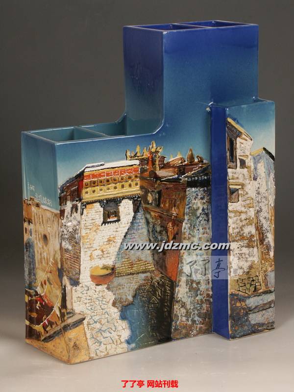 运用大小不同的刻刀,创作时直接在坯体刻出所要表现符号,包括浮雕经高温烧造后,形成画笔无法替代的物体轮廓线,如图上图墙形状建筑的轮廓就有这样的技法。
