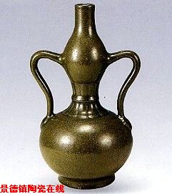 茶叶末双耳葫芦瓶 清乾隆 高26厘米 “大清乾隆年制”六字三行篆书款,器形周正,两侧以细长的绶带如意柄装饰,束腰部模印菊瓣纹,潇洒飘逸,满施茶叶末釉,釉色纯正均匀。