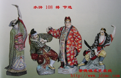 但是,陶瓷雕塑家们,不仅在塑造单个的形象上获得了成功,而且在组雕、群雕的塑造上也同样取得了令世人注目的艺术成就。曾山东的《孙悟空大战众天神》、李恭坤《三国演义》等,都是有代表性的取材于文学作品的艺术形象塑造。特别值得一提的是《水浒108将》大型人物群雕艺术形象的塑造所取得的高度艺术成就。