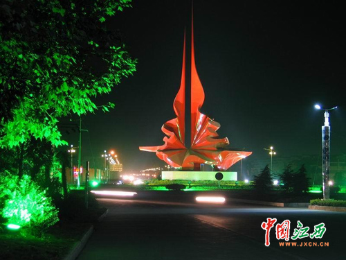 抽象、夸张变形的城市雕塑将景德镇古文化在—定程度上对时空和理念表现出了更多的适应弹性,更给人们丰富的想象和启迪。 “神火”这高达3 6米, 宽约1 8米,美仑美奂的城市雕塑,在连接景德镇出口的迎宾大道上, 一眼望去, 宛如——盆熊熊燃烧的烈火, 该城雕为彩色不锈钢材料制作, 多种抽象形式特有的单纯性、表现性、构成性及更具力感和扩张感, 反映了景德镇这个城市的精神气质。如果说 “神火”是一座反映了城市的精神气质的雕塑, 那么城雕“昌江之水”则是—件向母亲河昌江致敬的作品。 昌江是景德镇的母亲河, 她哺育了—·代又一代勤劳智慧的瓷都儿女。制瓷离不开水,运输依然。历史上, 昌江之水曾经无数次承载着精美的瓷器走向世界, 传播中国的瓷文化精神。这高5米, 6个蓝白相间的动感水滴组合成直径为lo米的雕塑群落,被放置在迎宾大道上,作品以水滴的形态围合成圆形, 构成水的形成。蓝色波纹,寓意美丽的昌江水源源不断、生生不息; 白色象征广阔的天空,一望无际。.水滴外体全部由碎瓷片拼贴而成, 远观极似龟裂。贴近触摸冰凉, 仿佛能感受到母亲河的渊源的历史与海纳的包容。 “昌江之水”与“神火”, 各据昌江大道的西东, 这水、这火遥相呼应, 喻意着瓷都的昨天、今天和明天生生不息。
