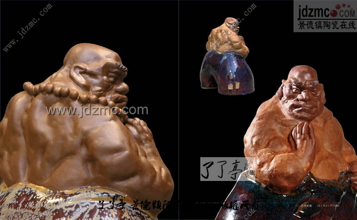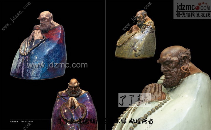 一袭袈裟被月光笼罩,天际星月构成了无限的禅意。观月、悟禅给达摩观月之外的张力,给人以空灵,超然的想象空间。钧瓷的月白釉如月色,在沉静中给人以厚重的质感,而又使人感悟佛的灵动。