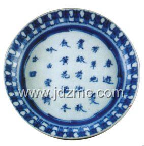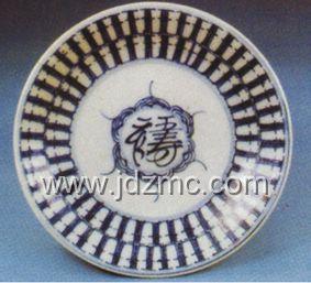 1、吉祥语类:宋元时期,应海上丝绸之路大量外销瓷的需要,一些青白釉、米黄釉粉盒上就印有“金”、“金玉”、“寿山福海”、“长寿新船”等字句。明万历白釉烛座上有“长命富贵金玉满堂”的题刻。清代德化窑的匠人就把刻、写、印有“福”、“禄”、“寿”单字、组字的碗、盘、碟和香炉等产品源源不断地推向市场。一只清中期青花开光“寿”字纹盘,其“寿”字由“五福禄寿”组形而成,构思新巧图1 。