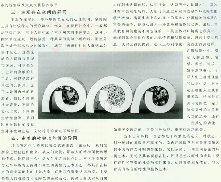 环境陶艺作品存在的客观空间是以人的意识形态、行为方式来区分的,所谓室内、室外这与人的生物属性、社会属性是有根本关联的。创作者在进行思维创造时会自主的遵守这样的规律,深层次的考虑环境陶艺在客观空间中的位置和将要扮演的角色。室内陶艺、室外陶艺分别从属于封闭式空间与开放式空间,前者具有一定的隐私性,是为个别个体或少数群体服务的,后者具有公共性,是大众的艺术,是被流动的人群所观看和欣赏的。创作者在对室内环境陶艺思维创造的过程中,在满足少数集体的物质、精神的需求后,更能够充分的、 自由的发挥个人对生活、艺术的诠释,浓郁的呈现出极具自由、个性的艺术魅力。相对应的,对于室外陶艺面对的欣赏主体是公共空间中的人群,这时就需要考虑到更多的因素,例如;城市的地理位置、城市的历史文化、城