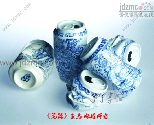 这几个易拉罐是按照1:1设计制作,外观采用了中国传统的“青花”工艺,图案也是中国的神话人物。准确地说,这是易拉罐造型的青花瓷艺术品,十分有意思。
