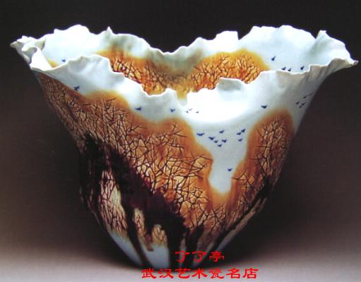 敝口,深弧腹,圈足,手工拉坯成型。唇沿作扭曲处理,呈不规则起伏变化,造型灵巧舒展。腹壁内外刻有树枝状凹线纹,棕黄色釉使线纹更加突出。自然流淌的铜红色釉,好像树干。棕黄的色调帙托出秋林的气氛,井与口沿起伏变化的造型相统一,空白处以青花色料点绘翱翔的群岛,表现了瑟瑟秋林的空阔景象。 |