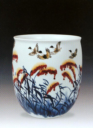 色彩绚丽明快的新彩瓷画,表现力很强。既可以精细勾线填色,又可以通过颜料的调配、稀释,在作画时,显出美观巧妙的丰富特色。 在釉上彩绘中,有新彩、粉彩、墨彩等类型,以多种颜料和不同的装饰工艺作画。新彩瓷画,以色彩丰富、清秀典雅为特点,可以根据陶瓷艺术工作者的创作技巧,或工笔重彩,或轻描淡写,或泼料渲染,或精细人微,充分显示出作者的艺术才能。 新彩,旧称洋彩,清代末期从国外传人。从陶瓷美术史料中,可以追溯到新彩的起源。清代晚期,在景德镇陶瓷彩绘技法中,出现了一种与粉彩画不同的釉上彩——浅绛彩。浅绛彩用黑料勾勒线条以后,敷上浅淡的赭、红、蓝、绿等颜料,画好后放进红炉烤烧。这种画瓷技法与国画的浅绛山水画有相似的特点,因此,被命名为“浅绛彩”。在作品工艺上,浅绛彩比粉彩简便,陶瓷艺人作画可以独自完成,不需要象画粉彩那样要由画工、填色工合作绘制。具有深厚艺术修养的陶瓷艺术家,在用浅绛彩画瓷时,即兴题诗于画作上,产生出高逸的情趣。后来,由于从事浅绛彩画的艺人很多,浅绛彩颜料在烧成后,又容易受潮湿的影响而脱落,因此,陶瓷彩绘艺人又发现了比浅绛彩更好的彩绘工艺——粉彩。粉彩把文人画的情调与传统彩绘工艺相结合,而且料色柔润明丽,浅绛彩就逐渐在瓷苑里消失了。虽然浅绛彩只风行了几十年,然而,却开创了新彩瓷艺的先河,与浅绛彩绘制工艺相似,又具有色彩绚丽特色的新彩瓷画工艺应运而生。 新彩颜料呈油质胶状,可以直接在白胎瓷器上作画,经烤花炉800℃左右烧成。作画时和烧成后的颜料色彩很少变化。创作时,通过浓淡深浅的料色,表现出景物的明暗层次,有很强的表现力。在料色的调配上,可以用油剂稀释,根据画面的需要,掌握颜料的厚薄。在表现形式上,不论是具象还是意象、抽象变形的画法,都能灵活自如地显示出画家创作意图。 从二十世纪五十年代开始,新彩瓷艺逐渐在陶瓷装饰中得到运用,八十年代以后,得到了很大的发展。从事新彩瓷画的人,既有老陶瓷艺术家,也有艺苑新秀。经过长期的研究试验,陶瓷艺术工作者在新彩瓷画的创作实践中,创造了多种具有新意的表现技法。在艺术瓷和日用瓷的装饰中,新彩瓷画得到了普遍的运用。 在新彩瓷艺的技法中,有流霞彩、水墨彩、玛瑙彩、珍珠彩、古雅彩和指画等技艺。 流霞彩:是二十世纪八十年代景德镇陶瓷艺术家的创新技法。利用新彩颜料用樟脑油稀释混和后,油性与料性的交融渗化特性,在瓷器上显示出奇妙纹理。犹如飘逸的云霞,瑰丽绚烂,流光溢彩。 在调配颜料时,让颜料充分吸收樟脑油等稀释溶剂,利用颜料在油剂中的晕化渗透。在作画时,根据画面的位置,用笔尖在瓷胎上点染出斑斓的纹理。在颜料流淌的过程中,自然地出现丝线般的肌理效果,浑厚华滋的天然韵致,产生出用笔勾线所达不到的奇妙料痕。采用这种技法表现山峰、岩石、荷叶、树干、原野、山坡等,能出.现自然的脉络肌理感,有国画“泼墨”技法的酣畅淋漓的特色。 水墨彩:能够显示出水墨在宣纸上的晕染韵味。水墨彩要用特制的颜料作画,饱蘸料色在陶瓷上重涂轻抹,产生分明的笔触和深浅虚实的变化。以厚重的墨色为主,墨分五色,通过“焦、重、浓、淡、清”的墨色和冷暖色彩的配合,展现出水墨彩的特征。经高温烧成后,颜料和瓷釉溶化在一起。墨色纷呈,色彩瑰丽,力透纸背,成为陶瓷上的水墨画。 玛瑙彩:用玛瑙红颜料勾线填彩,以红艳的色调为基本色彩。采取玛瑙红彩绘技艺绘制的作品,以工笔画为主,以山水画为主要题材。布局严谨,构图疏朗,注重突出瓷器晶莹玉润的材质美,既有图画的装饰风格,又有陶瓷装饰的特点。有用新彩画法的作品,也有结合粉彩、墨彩技法的装饰。 珍珠彩:其工艺技法是,在珍珠釉瓷器上,运用喷、洒、泼、画等技艺,利用油料的吸附特性和颜料的流动特点,表现出水彩画般的效果。在装饰工艺上,突破了传统釉上彩的模式,把色块的渲染和线条的穿插相结合。喷洒的颜料降低了釉面的光线反射,产生出亚光效果,画面新颖别致,色泽柔和。 古雅彩:用古雅彩技法绘制的作品,格调高雅,风韵古朴。借助陶瓷装饰材料和彩绘工艺,再现中国历代名画的风采神韵,有很强的艺术表现力。在瓷器上制作出年代久远的古代宣纸书画效果,画面层次清晰,意境幽远,为长期保存古代名人字画开辟了一条新途径,被誉为“瓷苑新艺、景德明珠”。 指画:利用指纹肌理和绘画技巧,产生出独到的装饰特色,创作时,以指代笔,在瓷器上涂抹按压出形象。手指、手掌的纹路与瓷釉相互穿插,使景物在形态变化和色彩对比中,显示出盎然生机,指画技法,打破了传统陶瓷彩绘勾线、填色的框架约束,可以尽情地表现画家的艺术想象力。 扁笔画法:陶瓷彩绘用笔,采用圆腹尖锋的毛笔作画,用笔尖勾线,笔毫拓色晕染。在新彩瓷艺中,用扁平的油画笔,就能表现出新的特色,扁笔的笔触较宽,蘸色刷画,力度更强,一笔画出的线条就能显示出毛笔的多笔。在表现山坡、地面、沼泽地时,尤能显示出特性。 适当地用自配的颜料在瓷器上点染,会形成奇妙的观赏效果。用毛笔蘸上煤油,在刚完成的画面上稍作点捺,就会出现扩散晕化的花痕,用这种技法表现岩石上的青苔、水渍、树干的节疤、山石的洞穴等,有意想不到的特色。在调配好的颜料中,掺上一点胶