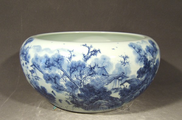 以祖国大好河山为表现题材的青花山水画,是陶瓷艺术工作者以名胜风景和乡村田野的自然景观为主题创作的,表现出大自然中的美妙景色。 大江南北,长城内外,到处都有奇妙的自然风光。大自然胸怀广阔,气象万千,我们面对雄伟的峰峦叠嶂,飞瀑流水,就会被美妙的风景所陶醉,会情不自禁地取出随身携带的纸笔,把眼前的美景画下来,作为青花山水画的创作素材。 青花山水画是在花瓶、碗、盘、瓷板的坯胎上作画,泥坯有较强的吸水性能,用青花枓在坯上绘画,经高温烧成后,有水墨画的酣畅淋漓的料韵,与国画山水有异曲同工之妙。青花山水在绘制风格上,吸取国画技法。把民间青花的笔墨技巧与官窑青花的高档材质相结合。在表现手法上,根据器型特点,结合当代审美情趣,采用多种绘制形式,形成青花山水画的艺术特色。 在料色运用上,青花山水画比人物,花鸟画的皴擦勾勒,点垛渲染的变化更多。用毛笔蘸料,在能吸收料色的胚胎上作画,表现山石云树流泉等各种物象的形态,需要用笔巧妙。采用兼工带写的手法,能准确地表现出山水、树石的质感肌理。画面清爽自然,有水墨画的渲染、渗化效果,又有陶瓷装饰的特色。 经过多年的艺术实践,我在青花山水画中,注重构图、皱法、技法、意境、情景、层次的安排,作品清新别致。 构图:作品中的疏密、虚实、动静、藏露,都要在构图中体现出来:画面的疏密,是块面和点线之间的区别。大面积的枓笆,会形成紧密的画面。料色的厚重处密集,料色的浅淡就是疏阔的景物。房屋汇聚是密,树林、坡岸为疏。疏密结合,有鲜明的对比效果。我创作的“江南水乡”青花瓶,山环水绕, 田园树宅密集。树木掩映,江河为疏。丛林密集,天高云淡为疏,山峦重叠与疏树横坡相衬托。虚实感是由自然山水的客观景物所决定的,在山水画的布局上十分重要。作品中的虚实,是在画面设计时首先要考虑的。虚实安排得当,画面就会吸引入。国画中虚实,有“疏可走马,密不通风”之说,显示了明显的虚实关系。密中有疏,疏中有密,虚实结合,才有协调的装饰构图。 青花瓷画讲究“水路均匀”,所谓“水路,”就是画面的空白“虚”处。“均匀”并不是平均, 画面景物平均,就会有平板的弊病。“均匀”是均衡。才能表现出构图美,虚实之间,既可以有衔接,也可以构成呼应对比。“虚”中有材质美,“实”是画面美。我绘制的“深山飞瀑”青花瓶,构图较密,在密集的重山叠嶂之间,以瀑布、云天、江河体现空间。虚实之间以人民居村庄,江边柳树穿插,实中有虚,虚实呼应。山水画是静态的,但是,画中的高山飞瀑、云飞泉涌、小船穿梭,飞鸟翱翔,又能产生动感,寓动于静态中。一件艺术作品的吸引人之处,首先就是动态景物。在山水画中,动物特别容易引人注目。动态既可以用人物、动物显示,也能从流水、云雾中产生, 自然界的山水,即使看一个局部,也会感到很丰富。把自然界的丰富景象表现出来,除了笔墨技巧以外,隐现藏露也是重要的表现方法:“山欲高尽出之则不高”,而以云雾显其高。建筑景物、树林、山峰,都必须有隐现,有藏露。隐约之间,给人以丰富的联想。 皴法:在青花山水画中,采用不同的皴法表现山石的质感。瓷画中的皴法,吸收了国画的皴法。从古到今,历代画家以造化为师,在作品中,形成了山水画“十八皴”。我国地大物博,塞北、江南的风景有不同的特点。西北高原,石骨凌峥。江南地区,山川浑厚,草木茂盛,不少名山大川都以其独特的地貌而姿态各异。因此,就必须用不同的皴法来显示江南塞北山川的不同地貌,皴法虽多,但是,按其特点,大致可分成三种类型。 (一)表现线条的皴法,其中有披麻皴,荷叶皴等,多以中锋用笔,笔法松散灵巧,表现草木繁茂的土质山峦时常用。 (二)表现大块面的皴法,如斧劈皴,刮铁皴,多用侧锋阔笔画出,展现陡峭坚硬的山石,质感刚劲有力。(三)表现点的皴法,有雨点皴、米点皴等,适合表现山峦的形状,我在青花山水中,多以斧劈皴法表现悬崖峭壁,用披麻皴显示江南水乡的丘陵,用荷叶皴画厚实的土山脉络。在“牧秋”青花瓷板画中,把白描勾线与皴擦相结合,皴法、晕染、干笔、湿笔并用,显示出素描画与水墨画相融汇的观赏效果。 技法:在表现技法上,把国画技法与西画素描、速写画法相结合。用线造型是绘画造型中的重要表现手段,不论描绘任何物象,都要用不同的线描形式,以体现不同物象的质感。线条是形象的骨架,山水画作品中的枯藤老树、小桥流水,以点、线、面结合,有水墨画的湿润和飞白笔触,也有晕染的虚实效果。粉彩雪景山水,可以用玻璃白来表现雪的厚实质感。 在青花雪景中,就要通过浓厚的料色与空白衬托,才能恰到好处地显示出冰天雪地的景色。 意境:山水瓷画创作,不仅要有熟练的绘画技巧,还要注重意境的表现,从和谐的布局,精密的构思和层次的安排来产生。复杂的景物中意境,构图简练的画面也有意境,民间青花山水画,往往只用寥寥数笔画出,一山一石,一草一木皆是有情物,通过景物来抒发作者的情感,表现出深远的意境。李可染先生指出:“意境是艺术的灵魂,是客观事物精萃部分的集中,加上人盼思想感情的陶冶,经过高度艺术加工达到情景交融,借景抒情,从而表现出来的艺术境界,诗的境界,就叫意境。” 情景:艺术作品必须表达感情,这种感情还必须是真挚深沉的。只有表