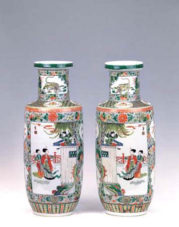 康熙朝61年间,其五彩器前后期的风格、画法、用色都有一定的区别。康熙早期的器物较多保留明代晚期的古拙 风格,浓红艳绿,单线平涂,纹饰布满器身。康熙五彩人物故事图花觚即是一件早期作品。该器高55厘米,胎 体厚重,侈口,颈下渐收,腹部有平凸,平底露胎。花觚是从明代崇帧年间的桶 状肌演变而来,清初时腹部渐突起 并由平凸发展为鼓状腹。觚的上部绘人物故事图,腹部绘折枝花、石榴和桃实。该器为釉上五彩,青花色泽青翠,彩绘为单线平涂,即勾线、填色的方法 无阴阳向背之分,无凹凸立体感。