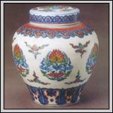 | 康熙本朝流行的斗彩器在彩绘技 法上仍承袭成化斗彩的风格,纹样采用平涂勾勒的技法而成,纹绘的色彩 微微越过釉下青花的边纹向外渗透。 在色彩的运用和具体施彩的工艺上有 了本朝的鲜明特征。明代斗彩一般都 是在白地上以釉下釉上彩拼逗而成, 康熙朝在继续生产这一品种的同对, 进一步创烧了黄地、洒蓝地等斗彩器, 从而使康熙斗彩瓷器的种类更加丰富 多样。器型以盘、碗、杯、笔筒、壁瓶 为常见,偶然也有稍大的多角形花盆、 长腹盖罐、签式碗、方盒等制品,纹 |