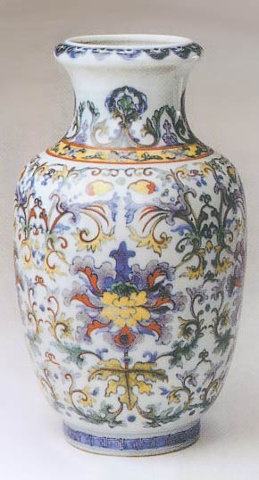 | 乾隆斗彩器具有器型变化多端、装 饰华丽繁缛、色彩绚丽缤纷的特点。传 世斗彩器各种器型均有,特别是高达50 至70厘米的大型斗彩器尤为流行。除通 体一种斗彩装饰外,乾隆的斗彩还常与 五彩、粉彩、珐琅彩、黑彩等品种组合 在一件器物上,这种斗彩与其他品种组 合的装饰是前所末有的。除此之外,金 彩在乾隆的斗彩中广为运用,金彩的流 行.使乾隆斗彩显得更加富而堂皇。器 型主要是盘、碗、瓶、罐、高足碗、花 觚、盒等,乾隆官窑斗彩纹样大多是按 朝廷送来的样稿或按圣旨要求设计的, 纹样大多寓有一定的吉祥含义,以缠枝 莲花、双鱼、灵芝、八吉祥等各种祥瑞 物组成的寓意"吉庆有余"、"福禄长寿"、 "富贵大吉"等四字吉语纹样为流行。 乾隆以后,斗彩瓷器的生产虽然始 终未停止,但制作工艺日趋衰退,图案 工整呆板,缺少变化。 |