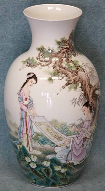 工笔人物画在陶瓷上主要通过线条、色彩、构图等绘画元素表现出来的, 各种元素之间相互呼应,通过具体形象的描绘创造出既有形象美又有装饰意味的陶瓷艺术作品, 是一种既与现实相符而又不等同于现实高于现实的一种理想美、意境美。是节奏与韵律同造型和谐而又高度概括的一种装饰美。