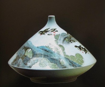 所谓“浅粉彩”,顾名思义,是相对传统粉彩和其它新粉彩而言,在画风上强调清新淡雅,有水墨淡彩的风韵,在色调上着重灰绿兰调子,在材料上改变粉彩原有面貌,独具特色的一个新画种。其艺术特点为: 色调浅淡、粉润柔和、层次分明、清新雅致。主要表现形式: 一是有鲜明个性; 二是统一色调; 三是重点突出与器型的结合。值得欣慰的是, 由笔者自2 0 0 2年始潜心钻研发明的浅粉彩, 拓宽了粉彩瓷绘的表现形式, 并以其粉润清秀、淡雅俊美的新意韵味获得了同行与市场的认可。笔者在浅粉彩的创作实践中, 十分注重继承粉彩瓷的原有特色(如: 粉色的厚重及浮凸感)此外,力求在立意、经营、色彩上做足文章。首先是立意,清人方薰华提出: “笔墨之妙, 画着意之妙也。意奇则奇、意高则高、意远则远、意深则深、意古则古,庸则庸、俗则俗。”由此,我在立意上坚持引发观赏者共鸣的自然之美。既清新淡雅又情趣横生、寓意深刻,追求“鸟欲言、花欲语”的境界。其二是在构图上苦心经营, 着重解决前辈绘画圆器主要以二围包裹的问题,多以通景体现三维视觉效果, 力图表现没有起点也没终点的气势。其三是在色彩上统一灰兰绿为主的色调, 为与白器型契合, 既要避免寡淡, 又要以冷色调子突出清新淡雅之韵味, 同时,还适度借用高温颜色釉来拓宽创作形式。当然独特的艺术语言来源于瓷画材料及瓷艺手段的独特性。它决定了创作者既是一个画家, 又是一个瓷艺家。须同时具备绘画功底与瓷艺技术方面的素养。