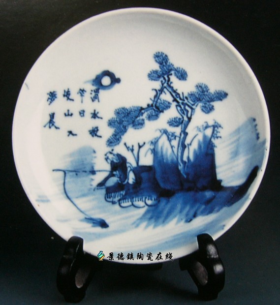 但是由于材料的不同,民间青花在构图上也有自身的独特性,其一,在构图上讲究“水路”(是景德镇制瓷人的术语,指青花纹饰中的空白之处,青花艺人们将“水散均匀”当成口诀是世代相传)变化,或以虚实浓淡,使画面的主题纹饰和反衬出来的空白形象有机结合为一体。青白对比,水路穿插的构图是青花中的重要规律。这不仅因为青花纹饰和造型是一个整体,它附着器型之上,是属于造型的一种装饰。均衡,灵巧的青色分布,易于达到理想的装饰效果而不至于破坏造型形体。而且因为,区别形象和色块,只能分出几个有限的层次的蓝色,很难达到鲜明生动表现对象的目的。假如缺乏最深层次而十分接近的几个蓝色调中,放弃空白这一手段,剩下的就只是蓝糊糊的一片混沌了。青花纹饰讲究蓝白对比、穿插的大关系,是装饰效果的需要,是表现优美白色瓷质的需要。如果没有充分、适当的空白,会使效果显得沉闷而呆板。因此和文人画中构图是不同的,文人画讲究“疏可走马”、 “密不透风”,而在民间青花中则是“密也可以透风,疏也可以走马”。这有利于衬托出青花纹样,使得青花纹样具有明朗、清爽的特点。