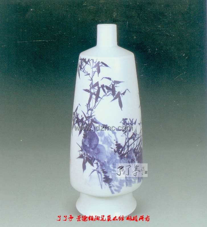 传统的工笔花鸟陶瓷绘画工整细致, 处处着力, 处处深入, 如果画面内容繁多, 画幅较大, 不但费时费力, 有时还觉刻板、繁杂,缺少大的虚实对比和节奏感。在作画过程中灵活运用泼、洒、 点、渲染的手法, 形成浑厚、朦胧、抽象的大片虚灵的色块,可以起到丰富和加强画面效果的作用。 由于画面加入了较大面积的整体抽象的形态可以造成画面大的气势,加强画面整体感。这种语言善于体现大感觉,大印象,把握大调子,使画面总体效果单纯、洗炼、整体、大气。并且大块朦胧、抽象的形态与精致细腻、具象的形态是两种不同的绘画语言, 有机地交融在一起, 形象蕴含其, 既清晰又模糊, 有松有紧, 有虚有实, 节奏感强, 形式变化多,既具功力, 又得灵气。 总体来说, 陶瓷绘画艺人多受过西方写生式训练, 在创作构图中总是不自觉的受到了西方焦点透视的影响, 把西方传统的焦点透视法应用到创作中。 另外西方印象派之后绘画构图在时空处理上较以往较为自由灵活, 有了较大发展。现代陶瓷绘画艺人借鉴了西方现代绘画中平面构成和超现实物象组合的认识。这些构图理念打破了传统陶瓷绘画构图中的时空观念和构图样式,对传统陶瓷的工笔花鸟画构图而言是极大地扩展和补充, 加强了画面的视觉震撼,具有强烈的装饰性。