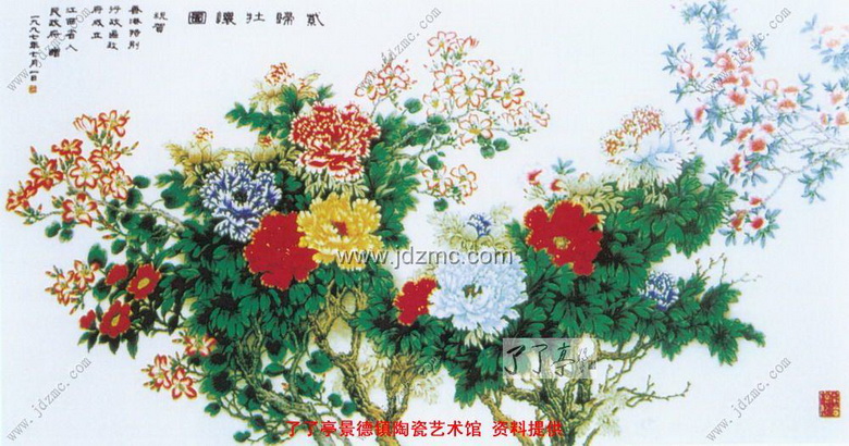 景德镇有世界"瓷都"之称,陶瓷装饰技法多种多样,粉彩就是其中釉上装饰的一种。而对于粉彩工笔花鸟装饰的构图在景德镇也形成了一种传统的画风。构图也叫"章法"、"布局",一件粉彩花鸟作品,即使作者有熟练的绘画技巧,如果构图不严谨,也会影响花面的观赏效果。花面的虚实、疏密、主次、聚散,是构图的重要因素,景德镇陶瓷美术工作者很注重这一点。虚实就是区别浓淡、远近,构图有虚实对比,才能产生变化。他们通常构图都会使画面疏密有致,多采用折枝花,富有中国绘画的风韵,将装饰性与绘画性交融在一起,通过对花面开合、虚实的处理,使花鸟形象达到均衡统一,并寓意于花鸟图案中,使画意吉祥福气。由于粉彩技法的特点,景德镇粉彩画与工笔国画联系密切,构图上也基本借鉴了国画"半景式构图"的方法,当花卉与动物组合时,画面中并非是二者的共处,更多的加入了山石、人物等。这也使得画面的内容更加生动、丰富。景德镇粉彩花鸟构图在主次对比统一上,花卉多作花面的主题纹饰,由于动物的加入,画面形式有了主次的对比。而在色彩上的对比统一,花卉纹饰设色鲜艳,富于变化曰动物的装饰则色彩更加丰富,与花卉纹饰形成了对比。在丰富的色彩变化中,动物纹饰却色多而不乱,与花卉纹完美的统一在一幅花面上,很符合视觉规律的安排,给人以感性的愉快和理性的满足。