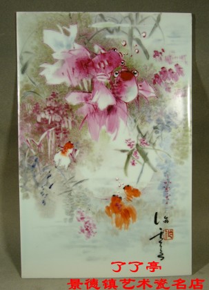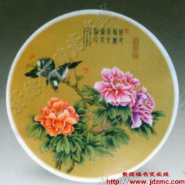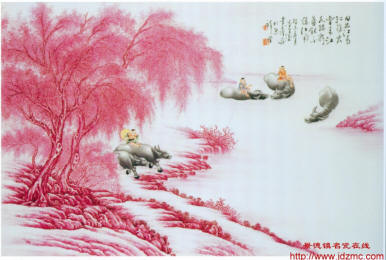 色彩绚丽明快的新彩瓷画,表现力很强。既可以精细勾线填色,又可以通过颜料的调配、稀释,在作画时,显出美观巧妙的丰富特色。 (程曲流《清江一曲抱春流》流霞彩)