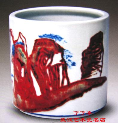 敞□,方唇,圆直筒腹,底沿微内收,圈足。造型以直线为主,庄重挺拔。画面笔调简练而纯朴,山岭气势轩昂,苍松疏朗古拙。釉里红红中泛紫,牵绿带黄,沉着多变,充分休现了现代釉里红的美感。