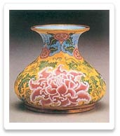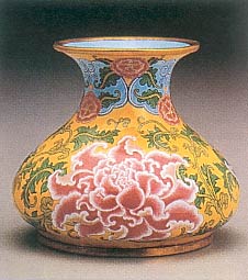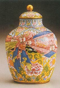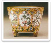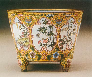 致,与高大的建筑交相辉映,更显得气势恢弘。造型式样显示出多方面的追求。帝王后妃盛放物品的画珐琅盒有圆形、方形、长方形,以及梅花式、葵花式、瓜棱式,还有屉盒和攒盒。乾隆朝画珐琅的装饰工艺趋向稠密细致堆砌式的特色,并往往与内填珐琅制作的技法表现在同件器物上。在绘画的部分,有些以掐丝为架构,例如画房子时,则以掐丝为轮廓,藉此增加釉在胎面的固持力。出现了仿青花瓷、仿内填珐琅、仿掐丝珐琅等多种效果。黄釉的色调变化多,明黄、淡黄、橙黄等都有, 明黄色的光泽度不及康熙朝。