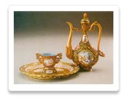 广东地区制造的贡品中还有一种独具特色的工艺,即在金属胎上贴金花或银花,表面再罩上透明的蓝色或绿色珐琅釉,金花或银花从釉下透出,表里呼应,分外晶莹。有的器物釉下没有金花或银花,纯以透明的釉色展示出独特的魅力。