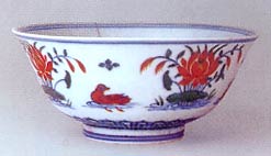 根据斗彩的定义,就目前资料来看,斗彩瓷器在宣德时已初露端倪。可以说明代斗彩瓷器工艺是在宣德青花五彩器的基础上发展而来的。釉下用青花勾勒 纹样轮廓线的工艺,在釉上黑彩勾线诞 生前无疑是衬托几种色彩的最佳色。 1984年在西藏日喀则萨迦寺发现的一对 宣德款青花五彩鸳鸯莲池龙纹碗,以及 1988年景德镇珠山御窑厂出土的一件宣 德款青花五彩鸳鸯卧莲纹盘,可谓明成 化斗彩工艺之先声。在这两件盘、碗中, 雄鸳鸯双翅及扇形飞羽,运用了填彩的 手法,即先用青花勾勒轮廓线,然后填 入红彩烧成。这种局部填彩装饰工艺,把 斗彩的发明从成化时期提前到宣德时期 是目前所见最早的斗彩工艺品。 斗彩瓷器发展到成化时期更趋成熟, 在胎釉、装饰、工艺技巧、造型品种等 方面都超过宣德窑。成化斗彩瓷器,胎 质细腻洁自、釉面滋润柔和、制作精细, 但其最主要的特征是典雅的色彩和特殊 的彩绘技法。