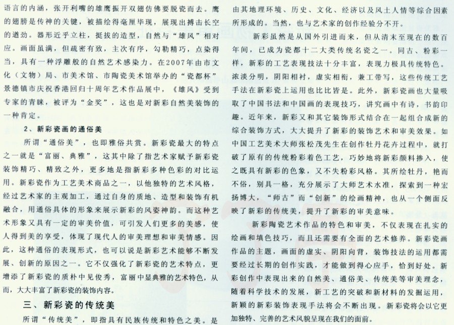 二、新彩瓷画的艺术审美 新彩瓷画既继承了传统陶瓷彩绘的优秀技艺,又有新的表现技巧:既有精细严谨、刻划入微的工笔,也有潇洒奔放、简洁明快的意笔。精细处毫发毕现,豪放处雄浑强健。大件作品,构思严谨,小件瓷画,绘制精妙。不受工艺的限制, 在配料、作画、用笔上,可以灵活地运用各种造型手段和表现形式,大大丰富了陶瓷装饰内容,形成了自然美、通俗美以及传统美等变化丰富的审美特征。 1、新彩瓷画的自然美 所谓“自然美”,就是内在的单纯、朴素美。任何一种艺术形式的出现,都与它所处的时代、环境息息相关,密不可分。新彩瓷所孕含的自然美,主要表现在“简炼的风格”。陶瓷美术工作者们充分发挥了新彩颜料的特性,赋予新彩瓷装饰以纤细、柔美、高雅、名贵之艺术感受。真实地表现自然的美,是艺术更高一层的境界。然而, 自然和真实本身并不反对精工雕琢,如果没有艺术家的刻划,没有技巧上的加工处理,纯粹照搬自然本身,那也就必然失去思想情感,也就无法谈及艺术的自然美。关键是如何处理和运用何种表现手法,达到新彩瓷画实与虚神化融合的境地。 在创作《雄风》镶器新彩瓷画时,我就较好地运用了自然美的审美法则。画面上并没有展示雄鹰凌空飞翔的矫健,而是描绘了雄鹰立足欲飞的瞬间形态。整个雄鹰画面布满了器形有限的空间,增强了雄鹰勇猛的气势,拓展了艺术