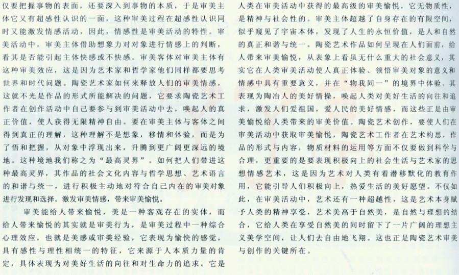 ����ǰ��̸���մ�����������������룬 �����մ����������ض�����Ȼ���ԣ��Ӷ�����������մ��������������У��������Լ�����ѧ���ɣ��մ�װ�δ��������ʽ��Ϊ�ḻ������Ҫ����װ����������ʽ������Ҫ��˹������������������ʹ�մ���Ʒ����������������벻����������(�۴���)���������ܶ��ķ�Ӧ(�����)��Ҫʹ�մ�������Ʒ������������еõ��������ܣ���Ҫ�������ǵ�������ã����Ҫ���մ����������߲���Ҫ�������������ף�����Ҫ���ǻ�Ҫ�������������Ļ����������մɵ���Ȼ������˵����Ҫ������Ҫ���ո�����й��մɵ���Ȼ��ѧ֪ʶ���磺����ѧ��װ�β���ѧ����ѧ�ȵȣ�������Ϊ������������У���������������Լ��������е�������֪ʶ�μӵ�����������ȥ�����������ݣ���ʽ��ϵ�������������ݺ���ʽ���ǽ������������ԡ���Ҫʹ�������������ܴ��ˣ����˵����飬�մ����������߾ͱ�����մɵ���Ȼ��ѧ֪ʶ���մɵ����������л��ؽ�����������մ���Ȼ��ѧ֪ʶ���մ������������ҵ����� ����г��ͳһ�� ��������У�����������ԣ��������������ָ�˶Կ۴������������̬�ȣ������������������չ�������ǽ���̸���������������մ���Ʒ�����ʹ������մ������еõ��������ߣ�����մ��Ļ��������ԣ��մ������ҵ������Ļ����������Dz��ɷ���ġ��մ������ƾõ���ʷ�Ļ����̣�����һ�ű�Եѧ�ƣ��ݹ��մ�ʷ������˵��һ���й��Ļ���չʷ��˵���DZ�Եѧ�ƣ� ��Ϊ���մ��Ļ����������š���ѧ����ʷ�����������Ρ���ѧ������ѧ������ѧ������ѧ�ȵȡ���������е������̬�ȼ�Ϊ���ӷḻ�������������������Ŀ۴����ڸ�����ʶ��ȫ���̣� ͬʱҲ�������ߵ�����۵ķ�ӳ���̡���ˣ���������Ҫ�ɹ��ؽ�����������ͱ����ø��������������������壬