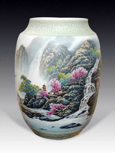 陶瓷艺术作品, 以人物、 山水、花鸟为主要题材, 山水重意境花鸟重情趣,而人物瓷画, 则讲究神韵。古人云:“风雅颂,精气神”虽然说的是《诗经》,然而,用这两个词来形容人物瓷画,也是很恰当的。 以鲜明的性格特征和传神写照为特色的人物题材作品,不论是用新彩、粉彩、青花形式造型,都讲究以形写神,突出人物的精神,气质,神态。 精神是一个人的灵魂,是通过容貌表情来体现的,古今人物瓷画中,仕女画是缺乏精神的,这与女性的温柔美的传统观念是有很大关系,我们翻开古代画册,古瓷图集,可以清晰地看到,其中的仕女都是眼中无神、表情呆滞。仕女的美, 仅以秀丽的五官来表现。 以捕蝶、采花、相夫、教子为主要内容,人物容貌虽美, 却缺乏精神,似乎流露出家庭妇女想走出围城, 走向社会广阔天地的渴望。现代仕女瓷画, 则有不少脸含微笑, 心情舒畅的神态。而高士、婴戏题材,就显得精神焕发,洗脱天真。 我的人物瓷画, 以古代仙佛、高士、勇士为主要题材,以人们熟悉的文学故事人物为表现对象。通过人物的表情和动态, 来揭示人物的内心活动。在历史人物中, 关羽是一位千古流芳的忠臣义上。经过历代朝廷帝王的推崇封号, 关公在民间享有很高的威望, 由一位武将提升到关圣帝君的高度。不仅全国各地有不少供奉关公的神庙, 关公的画像也以惊天地、泣鬼神的英雄气慨,而受到人们崇拜。关公的形象是凛凛威风, 精神激昂。像这样一位集英雄与神灵于一身的著名人物,用工笔重彩的表现形式,就能体现出庄严,肃穆的气势,令人肃然起敬。在“浩然正气”瓷瓶中,我以浓料重彩绘画。关公气宇轩昂,手持大刀的周仓,执剑在手的关平,护卫在关公身后,神态威严。在人物服饰的色彩上,我作了分别处理。关公红脸, 身穿绿袍; 周仓黑脸, 身穿鲜亮的黄衣; 而关平的衣袍, 则用玛瑙红敷彩。人物神态相似,而衣饰色彩形成衬托对比,给人以色彩丰富的视觉感觉。 气质反映出一个人的职业、身份,也是性格的反映。高士与仕女、神仙与凡夫, 都有不同的气质,气质通过人的表情表现。儿童活泼奸动,性格尚未成形, 是谈不上气质。我在“八仙祝寿”新彩瓶中, 以兼工带写的手法表现八仙的不同气质, 不同的性格特征。 吕洞宾白衣秀上儒雅神态, 剑现灵光鬼魅惊: 汉钟离洒脱豪放, 轻摇小扇乐陶然; 铁拐李神态疯癫, 葫芦岂只存五福: 张果老仙风道骨, 渔鼓频敲有梵音: 曹国舅神态持重, 玉板和声万籁清; 蓝采和、韩湘子性格开朗,花篮内蓄无凡晶,紫萧吹度千波静:何仙姑端庄温柔,手持荷花不染尘。在创作寸, 先在瓶口, 瓶足的坯胎上雕刻出荷花图案,施以影青釉,人物绘画与色釉图案融汇,与传统的人物瓷画相比,有不同的装饰特色。 神态与精神、气质既相似, 又不同。有修养的入神态都较含蓄, 外柔内刚: 而缺少文化知识的人往往是喜形于色,性格直爽。大肚弥勒佛是一位仙佛,却有着老顽童般的活跃开心。我在描绘弥勒佛的形象时,采用意笔手法创作,生活地体现出他的寓庄于阶的凡人神态, 如果改用工笔重彩, 人物的神态就会显得拘谨,缺乏生气。在寺庙中, 我们都能在大雄宝殿的如.来佛的背后, 见到“大肚能容天下事,慈颜赏笑世上人”的布袋和尚,他笑口常开, 两耳垂肩, 没有神的威严,却有孩童般的顽皮好动。布袋和尚的神态, 其实有着佛教的深刻教喻: 人生在世,都免不了坎坷磨难, 曲折烦恼是常有的。遇事要“看破放下自在随缘”, 随遇而安。与庙宇庄严释迦牟尼的雕像相比,大肚罗汉给人以亲和力,更容易受到信众的喜爱。见到弥勒佛的袒腹露胸, 赤足的眉开眼笑, 我们都会情不自禁地被感染, 而忘却心中的烦恼。我在刻划形象时, 突出他的诙谐幽静, 自得其乐。 “皆大欢喜”瓷板画, 手持荷花的布袋和尚,挥舞着佛珠, 引来蝙蝠飞舞。作品把墨彩与新彩、粉彩相结合绘制, 弥勒佛的衣袍用大写意笔触,料色淋漓酣畅。脸部、手足则以工笔勾线,表现出肌肤的受光面, 使人物形象产生立体感。 以蝙蝠的“蝠”与“福”、 “佛”同音, “荷”与“和”的谐音,含蓄地表现出作品的吉祥内涵, 烘托出“和谐幸福、 皆大欢喜”的意蕴。 在“其乐无穷”瓷板画中, 则把弥勒佛的超凡本领体现出来。在他的笛声呼唤下, 两条老牛闻声而动, 倚靠在大肚罗汉身边, 似乎听懂了仙曲的旋律。在这件作品中, 我把人物与动物相结合, 突破了传统佛像的构图形式,别具一格的构图立意,给人以耳目一新的感受。在人物瓷画中, 注重表现不同人物的风度、高雅,歌颂壮士的高尚情操, 以形写神,就成为艺术创作中的“风雅颂、精气神”。 |
